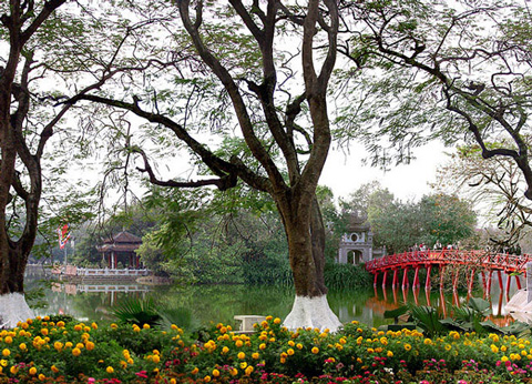 It was built on Ngọc (Jade) island in returned sword lake in Trần dynasty (1225-1400). National hero Trần Hưng Đạo and some illustrious writers are worshipped in the temple. Originally, it was a small temple and enlarged time by time. In 1865, Ngọc Sơn temple was renovated the shape which we can see today. A large pen -shaped tower (Tháp Bút) was built at the entrance of the temple. On the Tháp Bút, there are three Chinese characters Tạ Thanh Thiên. Behind Tháp Bút it is Đài Nghiên (Ink Stand). Passing Đài Nghiên, you walk into the temple crossing Thê Húc bridge made of wood.